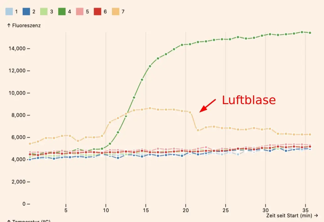 Air bubbles (incompletely filled reaction chambers) can cause invalid reaction curves which increase suddenly or jump around, due to optical refraction effects. These can even cause false positive results.