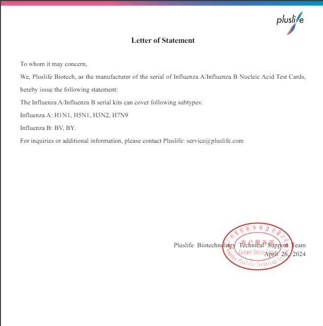 Pluslife has confirmed that the Flu tests work for H5N1. However, you won't know whether it is H5N1 or another influenza strain.