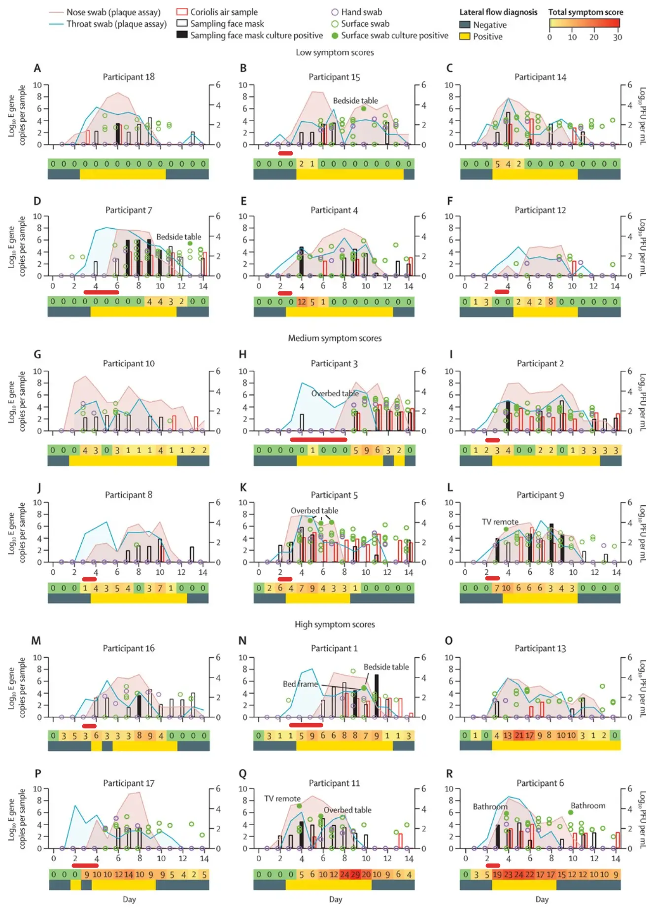 In the Imperial College Human Challenge study, almost all patients had detectable virus in their throats 1-2 days earlier than in their noses. We marked the time delta with red bars: